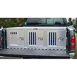 | ✚✚✚ Hunter series dog box with 12" x 12" Vents in back only without Storage Overall Dimensions: 58"W x 40"D x 20"H Dog Compartment Dimensions: 19.25"W x 39"D x 19"H with notches in side for short bed trucks Storage Dimensions: The 55040 is a triple compartment dog box constructed of rugged diamond tread aluminum. This box features lockable slam latch doors with storm covers, rear vents with removable covers and cross ventilation between the lined compartments.
